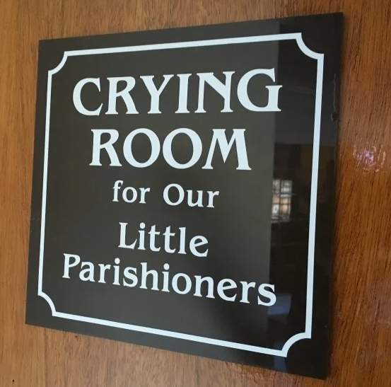 The Cry Room, or Quiet Room, in church is there for a very worthwhile purpose. It is for a child who may be restless, crying, etc. This space enables the child and parent to still be able to hear the Mass yet not disturb the people around them in the main church proper. But this space is limited in size and in the number of people able to be accommodated. Therefore, please do not use this space for any other purpose than stated above. It is not a space for multi-members of a family to reside during Mass. This limits other people from using the room. Thanks for understanding.